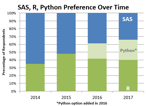 As many of you probably know, over the past few years we’ve been gauging statistical tool preferences among data scientists and predictive analytics professionals by sending out a flash survey to our network: the first two years weighing SAS vs. R, and then adding Python to the mix last year as their libraries expanded.Now, as one might imagine, the discussion is always rather spirited in nature – we’ve had over 1,000 responses every year – and reading the comments has become one of our favorite parts of doing the survey, so feel free to chime in!To keep the comparison simple, we only asked one question: Which do you prefer to use – SAS, R, or Python?