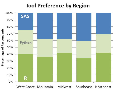 Similar to last year, the largest proportion of Python supporters are on the West Coast and in the Northeast, however, the Mountain region is close behind the Northeast, and all regions saw at least some increase in Python preference. R preference is highest in the Midwest and SAS preference is highest in the Southeast.