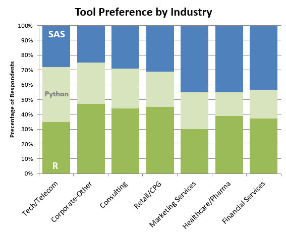 Here you can see the comparison in tool preference between traditional predictive analytics professionals working with structured data versus data scientists working with unstructured or streaming data. There is a clear preference for Python among data scientists, whereas predictive analytics professionals’ preferences were more mixed.This distinction is interesting when compared to the tool preferences of professionals in the Tech industry vs. the Marketing/Advertising Services and Financial Services industries. As we’ve found in our salary studies for Data Science and Predictive Analytics, 41% of data scientists work in Technology, whereas in predictive analytics 52% of professionals work in Marketing/Advertising Services or Financial Services – only 12% work in Technology.