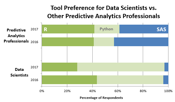 Support for Python grew slightly among predictive analytics professionals, from 16% in 2016 to 20% this year, however among data scientists the increase was much higher – from 53% in 2016 to 69% in 2017.
