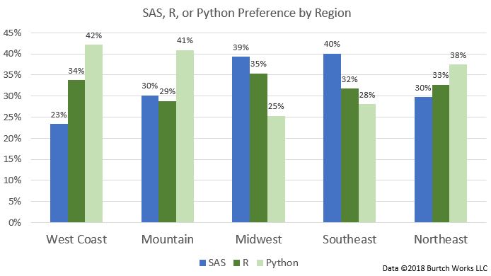 As with last year, the largest proportion of Python supporters are on the West Coast, with the Mountain region close behind. Same as in 2017, R support is strongest in the Midwest, and SAS is most dominant in the Southeast. Python gained support in every region when compared to our 2017 survey results.