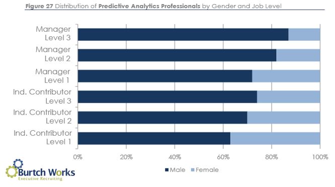 We also studied gender distribution between PAPs and Data Scientists in the report. 26% of the sample for Predictive Analytics Professionals were women; for Data Scientists, 17% of the sample were women. Compared to last year, the sample showed an increase of 2 percentage points for women in predictive analytics and an increase of 2 percentage points for women Data Scientists.The largest percentage of women for both Data Scientists and PAPs was among level 1 individual contributors, indicating that more women are entering the field. This may indicate that the gender ratio will become more equal as these junior workers become more experienced.