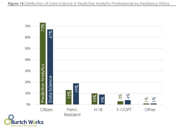 A sizeable portion of both Predictive Analytics Professionals and Data Scientists working in the US are not citizens. The study found that 27% of PAPs have some form of visa or permanent residency status, while that percentage is 33% for Data Scientists sampled.For those in predictive analytics, 13% of the sample were permanent residents, 10% had an H-1B visa, 3% had an F-1/OBT, and an additional 1% had some other form of visa. For Data Scientists, these percentages were 19%, 9%, 4%, and 1%, respectively.