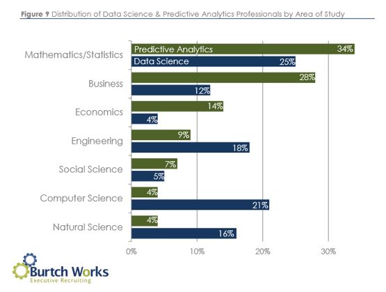 As one would expect, those in Predictive Analytics who held an advanced degree tended to earn more than those whose highest level of education was a Bachelor’s degree, but this was not true at all job levels. However, PAPs with a PhD out-earned holders of a Master’s degree at all levels.Data Scientists with a PhD earn more than those with a Master’s degree at every level except level 2 and 3 managers. In some managerial positions at higher levels, leadership and management skills often matter more to employers than education.Mathematics and statistics were the most common field of study in terms of highest degree for both PAPs and Data Scientists, but there were some key differences. PAPs were significantly more likely to have a degree in economics or business, while Data Scientists were more likely to have a degree in computer science or engineering. The business degree category includes Master’s in Business Analytics degrees, which have become increasingly popular in recent years.