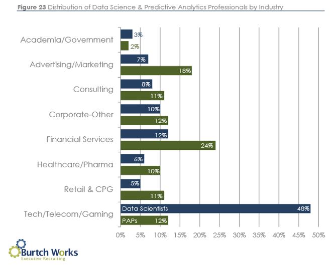 The most common industry for PAPs was financial services, where 24% of the sample worked. 18% worked in advertising/marketing, the second most common industry, and 12% were employed in the tech/telecom/gaming industry.Data Scientists were overwhelmingly employed in the tech/telecom/gaming industry; 48% of the sample worked in this field. This was followed by businesses involved in financial services, with 12%.