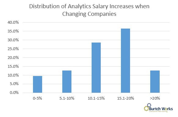 The chart below shows the distribution of analytics salary increases received when changing companies within the past year, and does not include those who received a promotion or otherwise stayed within the same company.
