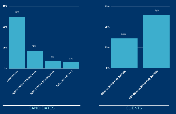 With many companies evaluating their WFH and remote work policies going forward, a survey was done earlier this year to gauge candidate and client WFH preferences.The idea that remote work has opened doors for individuals to work in cities across the country is shifting quickly towards more frequent requests to relocate. This evolution in policies is generally translating to a hybrid model where individuals are expected to come into the office on a partial or as-needed basis. With that said, there are still plenty of roles open to those that are seeking a fully remote position, but they are not the majority of roles available as often assumed or reported by the media.Based on discussions with a wide range of companies looking to hire, it is evident that they are looking for candidates that are open to going into the office at least twice a week, and there has been a greater push across industries to return to office in some capacity. This trend will continue to be monitored.