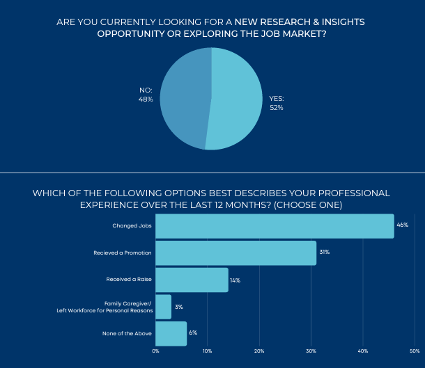 Given the volume of professionals changing jobs along with the buzz surrounding the Great Resignation, we surveyed marketing research & insights professionals to gauge movement and priorities when considering new opportunities. At the time of fielding, over half of research & insights professionals were currently open to a move, while 46% changed jobs in the past year.