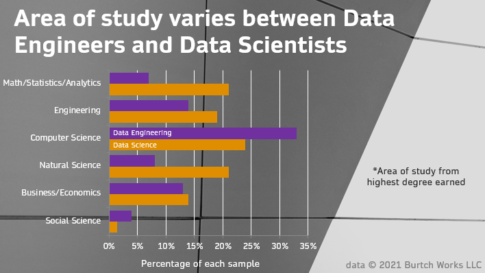 While data engineering and data science are very different fields, these professionals often work very closely together, and, with the increasing prevalence of hybrid-type roles, we’re often asked a lot of questions about the differences between their backgrounds and skillsets. One of the most notable differences that we’ve found is with their typical educational backgrounds, including highest degree earned as well as typical fields of study.In our sample, we found the most common degree for data engineers is a Master’s degree (62%) followed by Bachelor’s degrees (32%), while PhDs were rare (5%). By stark contrast, the most common degree for data scientists in our 2021 report was a PhD (49%), followed by Master’s degrees (45%), and only 6% held a Bachelor’s degree. Having a Master’s degree can be a competitive advantage for data engineers during the hiring process. Also, since it is much more difficult to find data engineering talent with a PhD, making this a requirement for your new hires may make a search more limited.Data engineers will typically have a degree in Computer Science or Information Systems, and although some may have Business Analytics or Statistics degrees, these may not be as desirable since they may not offer as strong of a coding background as the computer science route. While many data scientists have Computer Science or Engineering degrees, there are also many with Math/Statistics or Natural Sciences backgrounds, which are very uncommon among data engineers.
