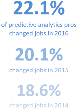 This year, we found that the percentage of predictive analytics professionals who changed jobs increased by two points, from 20.1% in 2015 to 22.1% in 2016. These figures do not include professionals who received a promotion or stayed within the same company.Not only that, but the 2016 percentage is an increase of 3.5 points from 2014, when only 18.6% changed companies. So, more people are hopping around, but not everyone has caught the job change bug quite yet.