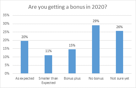 We found that 20% of respondents were getting their bonus “as expected”, meaning a bonus in a roughly similar amount to what they would normally anticipate. 11% said that they were still getting a bonus, but it was smaller than expected, while 15% said their bonus was actually greater than they would have expected (noted as bonus plus in the chart above).The largest portion of respondents – 29% – said they were not receiving a bonus for 2020, and 26% were still uncertain at that point. For many firms, what the bonuses look like may still be unknown until some point in the first quarter.Since this is the first year we’ve asked this particular question, we don’t have historical data to compare to previous years, but we thought this information would still be helpful to those wondering how many of their colleagues are getting bonuses this year.