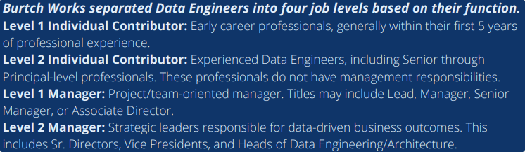 Bonuses varied depending on job level, especially between individual contributors and managers. For early career individual contributors, the bonus mean was $22,283, while for senior-level leaders the bonus mean was $64,218. For more information on how we define data engineers you can check out this post, and to see how we segmented the data engineers in our data sample, you can read the table below.