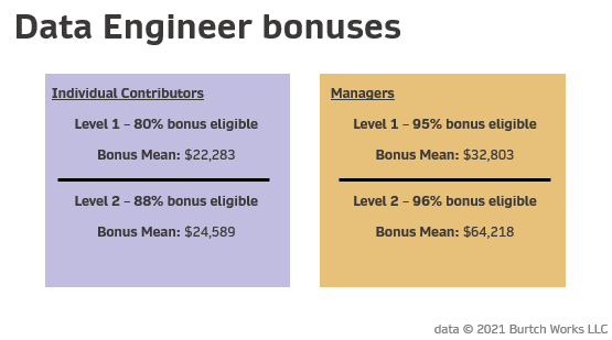 One interesting thing that we found while examining our report sample data on bonuses for data engineers is that bonus eligibility in this field is very high, making bonuses a key portion of the compensation package. 80% of early career individual contributors (those within the first five years of their career) are bonus eligible, which goes up to 88% for senior individual contributors, and 95-96% of managers.