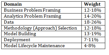 Now, about that practice-based Exam … you get 3 hours to complete 100 multiple-choice questions, based on typical tasks performed and knowledge applied by analytics professionals. The Job Task Analysis identifies 7 domains as shown in the table below; weights represent the number of questions in each area. It is available as a computer-based test at over 700 locations through Kryterion. Pencil-and-paper exams are available in conjunction with INFORMS conferences. Oh, and you get to use a 4-function calculator that we provide.