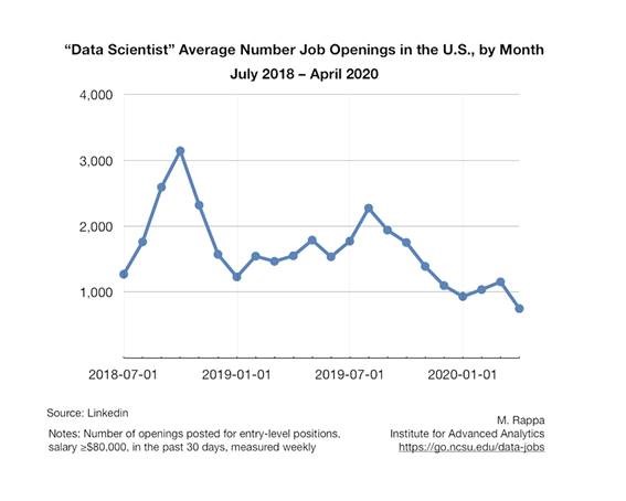 There was also a decrease in the average number of job offers per student, from 2.5 in 2019 to 2.1 in 2020, and several students had job offers either put on hold or rescinded altogether.Another interesting piece of information he was able to share was his data on entry-level data scientist job postings on LinkedIn, and how that has dipped recently as well.