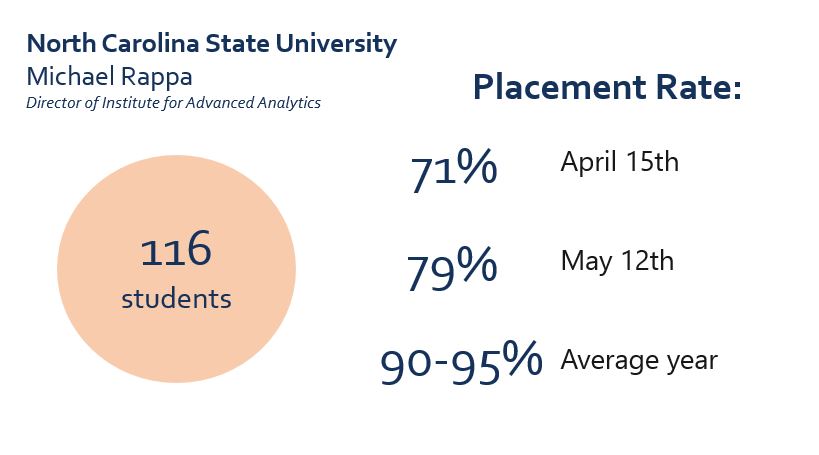 As you can see, there was a noticeable dip in the placement rate for NCSU compared to average years which reflects the overall uncertainty in the analytics job market at the moment.