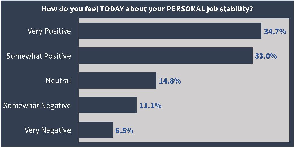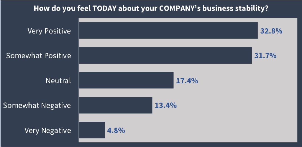 Our last question aimed to determine whether employees felt generally positive, negative, or neutral, both about their personal job stability and their company’s business stability. The results lined up relatively closely – employees generally felt the same sentiment about both aspects rather than a mix. We found 67.7% of respondents feeling positive about their personal situation, and 64.4% feeling positive about their company’s business situation. In terms of negative sentiment, 17.6% of respondents reported feeling negative about their personal stability and 18.2% felt negatively about their company’s stability.