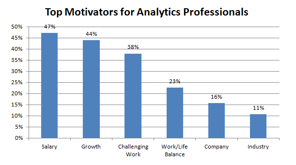 ConclusionsQuantitative candidates are more in demand than ever, and if the results of this poll are any indication the talent pool is ambitious and hard-working. Their focus on salary is interesting, and reflects what I found in the Burtch Works Study last year – that Quants changing jobs can expect a 14% pay increase. When compared to the average 2-4% yearly increase they can expect if they stay at their jobs, it’s no wonder the hiring market is humming with activity and that salary is a top motivator.Opportunity for growth was a close second, and it seems that analytics professionals are evaluating “promotability” when considering new roles, compared to the opportunities available in their current organization. For my analytics job seekers, I wanted to offer a word of warning here – although you can realize an increase in pay, I usually don’t see candidates substantially improve their title when changing jobs. It’s much more common to see a candidate make a lateral title move when changing companies, knowing that there is a greater possibility for a promotion down the line in their new organization because it is in a growing field or expanding.In another blog post we’ve also posted the results to our second question, “What was the source of your last job?” Follow Burtch Works on Twitter or LinkedIn to get the best quantitative career news and blog updates delivered right to your news feed, and check out our YouTube channel for access to all our latest salary information and webinars!