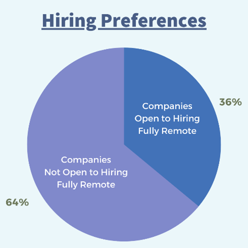 In our sample, over half (64%) of companies are not open to hiring individuals that will be working remotely. They are seeking employees that are willing to comply with their hybrid model and are either based in a city in which they currently have an office or are willing to relocate.On the other end of the spectrum, of all total companies, only 36% are open and willing to allow their employees to be fully remote. This includes the full onboarding process and all ongoing work to be done from any location, and they are not required to come into the office on a cadence or project basis.