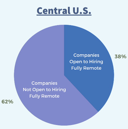 Of the companies located in the central region, (38%) are open to individuals working fully remote, and (62%) are seeking professionals that are willing to come into the office.