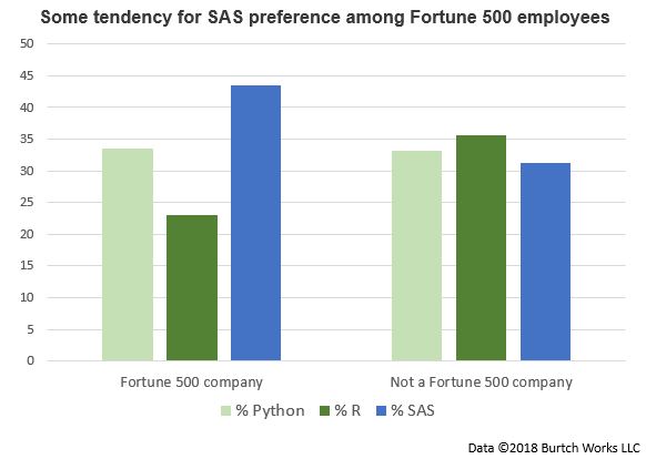As one might imagine, there is some tendency for Fortune 500 employees to prefer SAS. This may reflect the fact that SAS’s proprietary software likely has a stronger foothold in larger companies while free software such as Python and R may be more appealing to smaller companies.