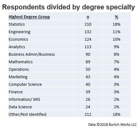 The largest easily identifiable degree specialty were the 18% of respondents with the word Statistics in their degree title (Statistics, Biostatistics, Applied Statistics, etc.). Interestingly, only about 2% of the respondents have a degree that contains “Data Science” which may reflect the relative newness of the degree, the selection bias of the sample as well as the recent tendency of many professionals to rebrand themselves as “Data Scientists” in response to market demand.