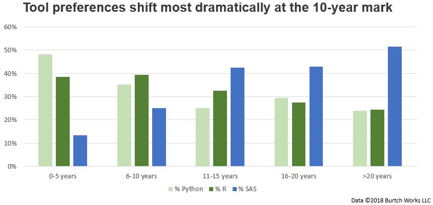 Classification and regression tree modeling showed that around 10 years of experience was the most important “cut point”, or the point at which tool preferences seemed to shift the most dramatically.