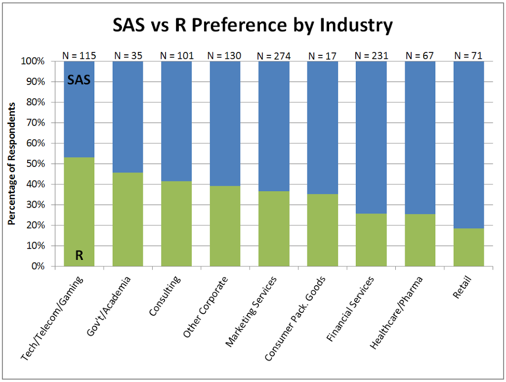 In almost every industry SAS is preferred over R, except for Tech, Telecom and Gaming companies. Retail, Pharma/Healthcare, and Financial Services have the strongest preference for SAS.