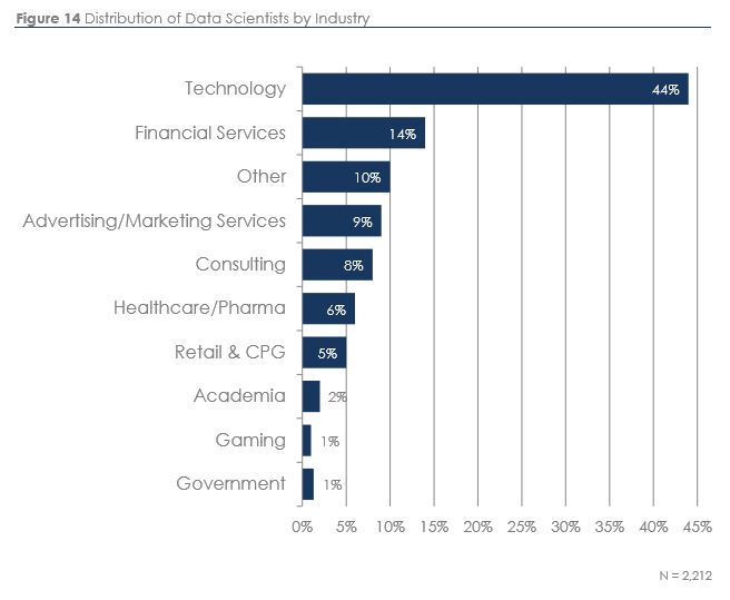 Another key point to keep in mind is that while technical skills and data science concepts may be non-negotiable, requirements such as industry experience or business acumen can often be trained up once the new hire has joined the data science team.Especially in the case of industry experience, it’s important to be aware of market availability when making this a hard requirement. Hiring authorities may find it exceptionally difficult to find data scientists with, say, 10 years of experience in healthcare or pharma, since many firms in these industries are still developing their data science capabilities.Below you can see data from our 2018 data science salary report, where you can see that although data scientists are beginning to spread to other industries besides Tech, if a Financial Services firm were to only consider data scientists currently working in that industry, they could be limiting themselves to a very small portion of the available talent pool.
